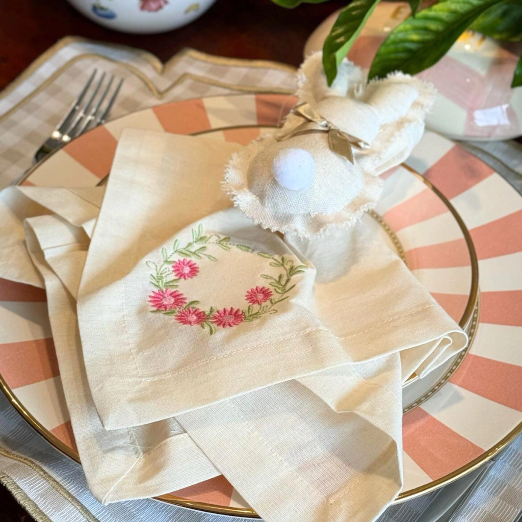 Um toque de elegância que transforma qualquer mesa. O Guardanapo Flor Pink é confeccionado em linho misto na cor off-white, com um delicado bordado floral em rosa que adiciona charme e sofisticação à composição.