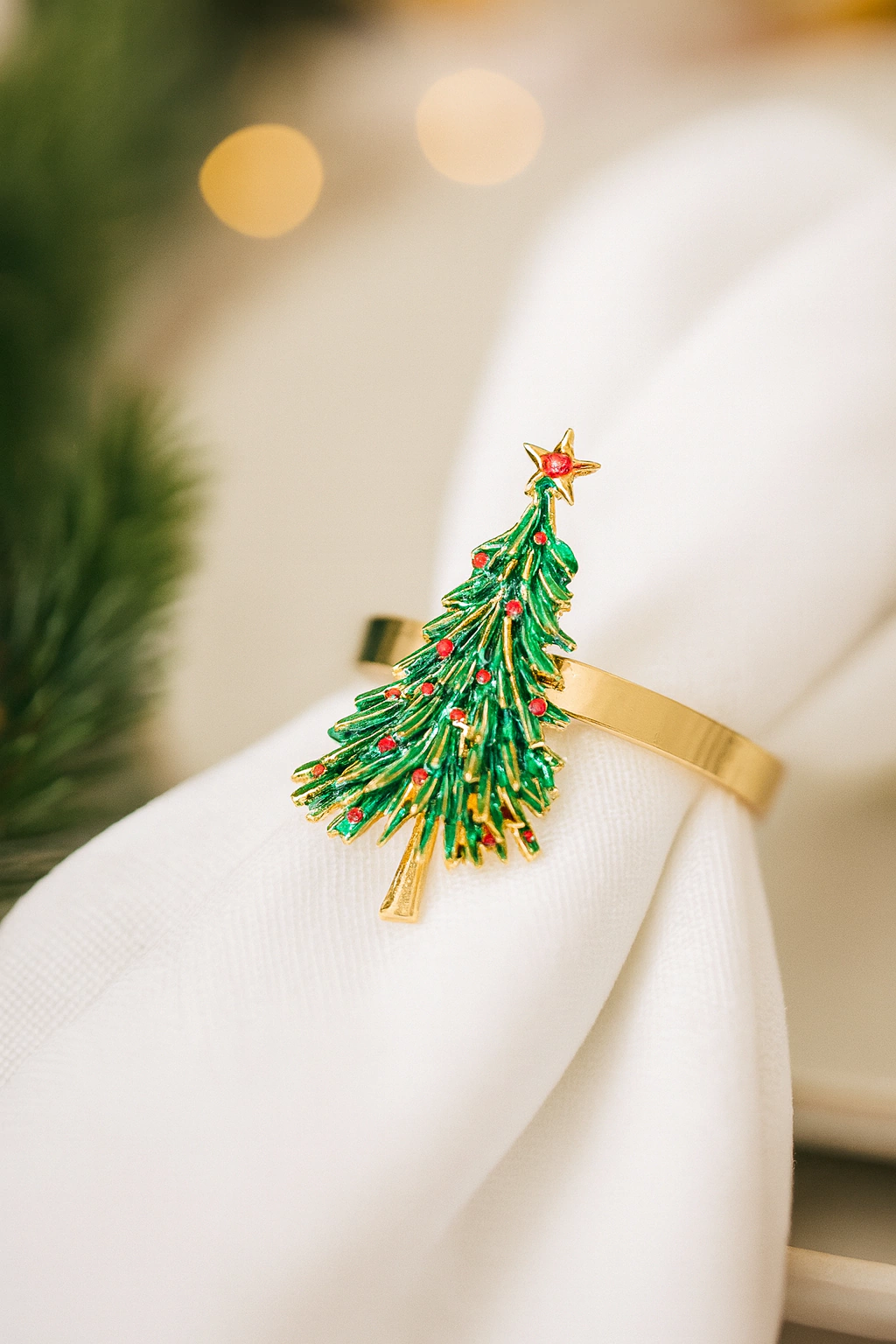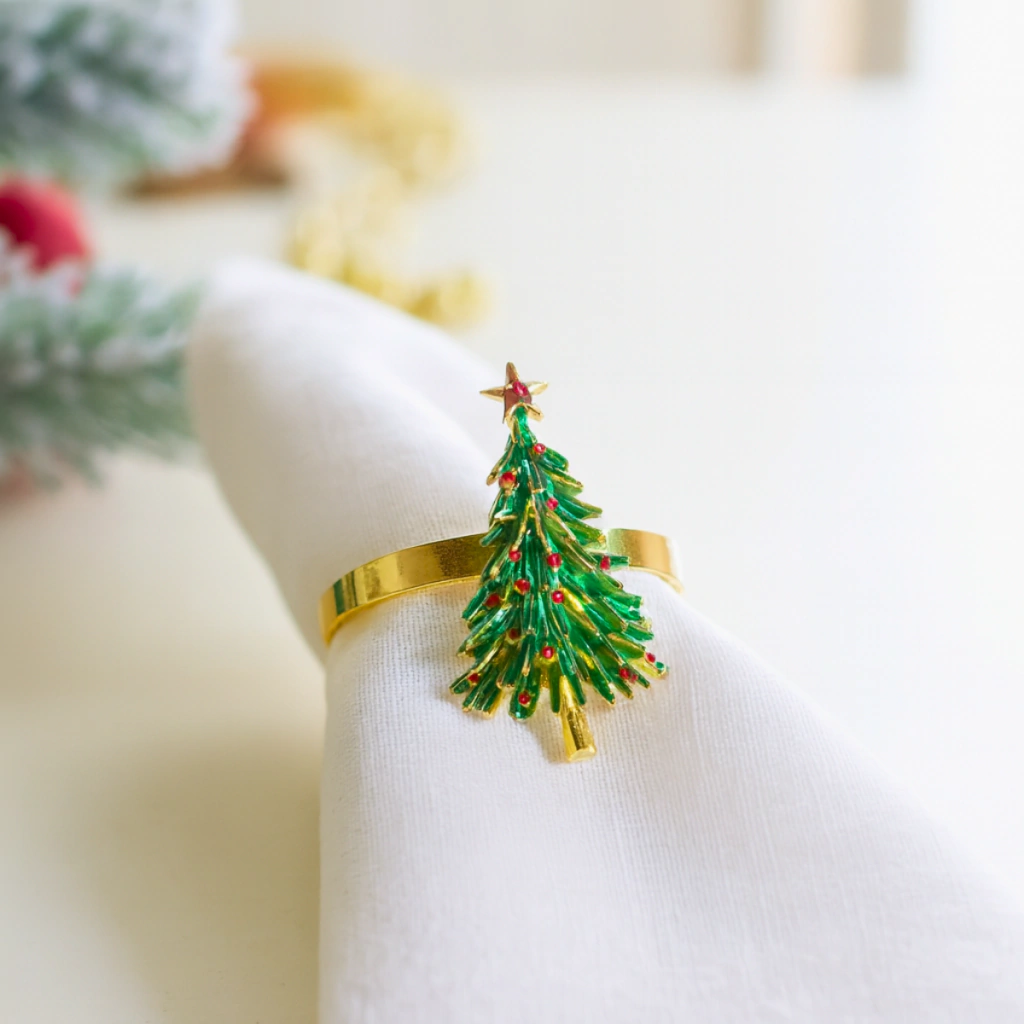 Deixe sua mesa posta ainda mais charmosa neste Natal com o Kit de 4 Anéis de Guardanapo em formato de Árvore de Natal. Um detalhe sofisticado e festivo que transforma qualquer composição em um cenário acolhedor e elegante para suas celebrações.