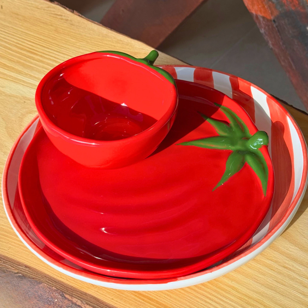 Esse kit combina o formato criativo do tomate com a beleza da cerâmica artesanal. Ideal para quem ama uma mesa divertida, acolhedora e cheia de personalidade.