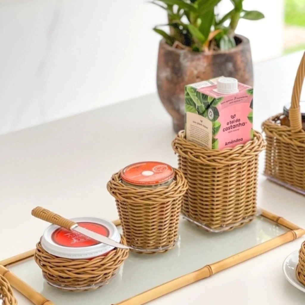Um toque rústico-chic para o seu café da manhã ou brunch. O Porta Suco Vime Trancoso foi desenvolvido para acomodar embalagens de bebidas no tamanho padrão com muito charme e praticidade. Seu acabamento artesanal em vime traz aconchego e sofisticação, enquanto a base em acrílico garante durabilidade e facilidade na limpeza.